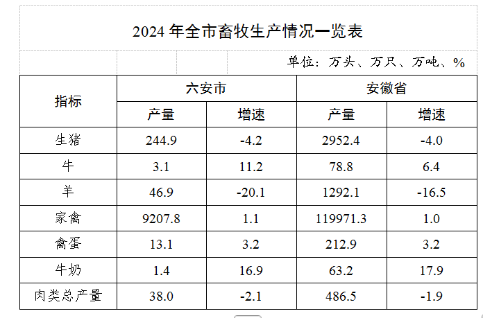 (一)牧业生产不稳定因素较多。我市牧业产值占比较大,牧业产值增速直接影响全市农林牧渔业总产值增速,其中占比最大的生猪是农林牧渔业发展的晴雨表。2024年,受养殖利润不高、环保整改等因素影响,部分养殖场(户)补栏积极性不足,生猪产能未能完全释放。全年生猪出栏数下降4.2%,低于上年5.1个百分点。占比较大的家禽出栏数增长1.1%、羊出栏数下降20.1%,分别低于上年5.2、5.9个百分点。