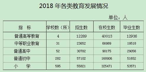2018年末,全市普通高校4所,当年招生12289人,比上年下降2.1%;在校生40013人,下降5.5%;毕业生12936人,下降1.7%。各类中等职业教育学校31所(不含技工学校),当年招生23652人。普通高中52所,招生30782人,高中阶段毛入学率119.5%。普通初中282所,招生57102人,初中学龄人口入学率为99.99%。小学595所,招生55821人,小学入学率为100%。