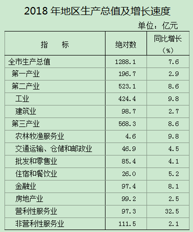 初步核算,全年实现地区生产总值(GDP)1288.1亿元,按可比价格计算,比上年增长7.6%。分产业看,第一产业增加值196.7亿元,增长2.9%;第二产业增加值523.1亿元,增长8.6%;第三产业增加值568.3亿元,增长8.6%。三次产业结构为15.3:40.6:44.1。按常住人口计算,人均生产总值26731元(折合4040美元),比上年增加2325元。