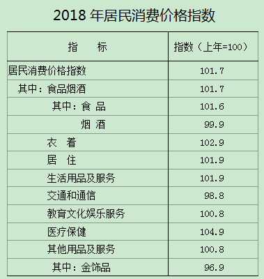 2018年,居民消费价格指数为101.7%,居民消费价格同比上涨1.7%。其中,食品烟酒类价格上涨1.7%,居住类价格上涨1.9%,医疗保健类价格上涨4.9%。工业生产者购进价格指数103.4%;工业生产者出厂价格指数101.4%。