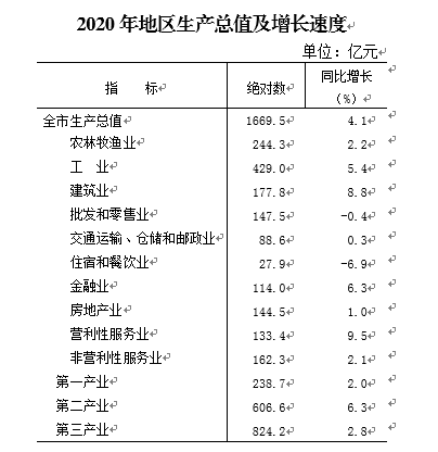 初步核算,全年实现地区生产总值(GDP)1669.5亿元,按可比价格计算,比上年增长4.1%。分产业看,第一产业增加值238.7亿元,增长2.0%;第二产业增加值606.6亿元,增长6.3%;第三产业增加值824.2亿元,增长2.8%。三次产业结构为14.3:36.3:49.4。