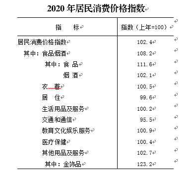 2020年,居民消费价格同比上涨2.4%。其中,食品烟酒类价格上涨8.2%,居住类价格下降0.4%,医疗保健类价格上涨0.4%。工业生产者购进价格指数97.9%;工业生产者出厂价格指数101.1%。