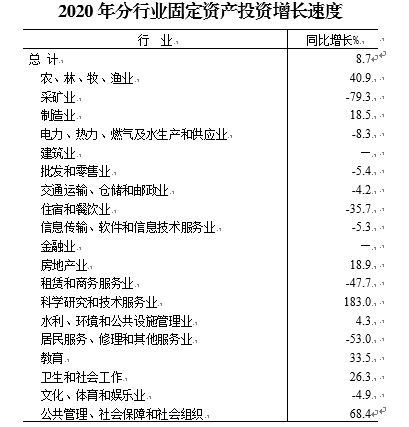 2020年全年完成固定资产投资比上年增长8.7%。分产业看,第一产业投资增长52.8%;第二产业投资下降0.8%;第三产业投资增长11.9%。