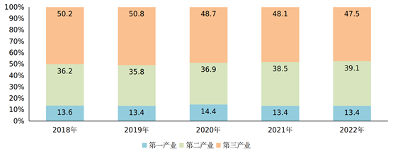 初步核算,2022年实现地区生产总值(GDP)2004.6亿元,按不变价格计算,比上年增长4.2%。其中,第一产业增加值267.8亿元,增长4.5%;第二产业增加值784.9亿元,增长7.2%;第三产业增加值951.9亿元,增长1.9%。三次产业结构从上年的13.4︰38.5︰48.1调整为13.4︰39.1︰47.5。按常住人口计算,人均生产总值45643元(折合6786美元),比上年增加2179元。